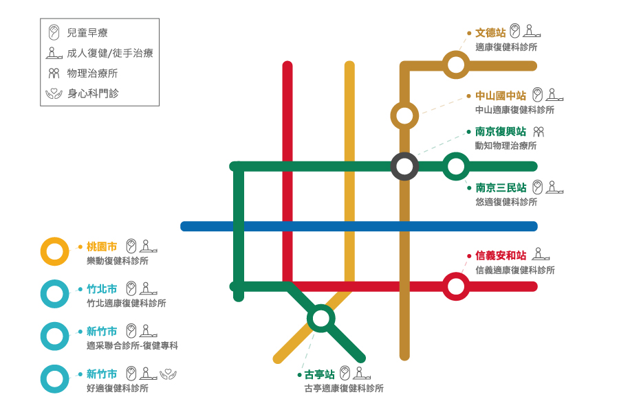 目前深耕大台北、新竹、桃園等地區,持續拓展優質復健醫療據點,讓更多民眾就近享有頂尖照護。
