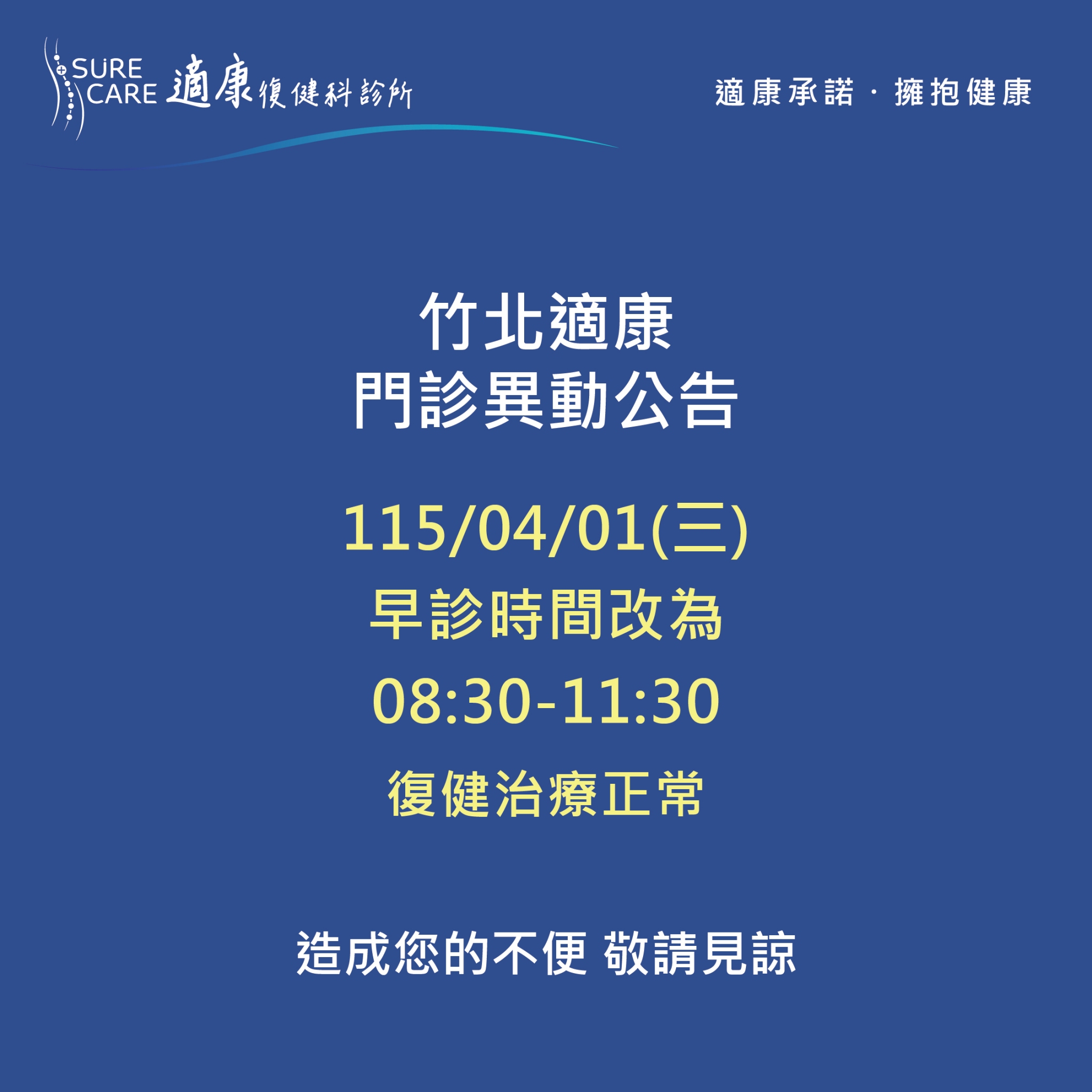【#竹北適康|門診異動公告】
