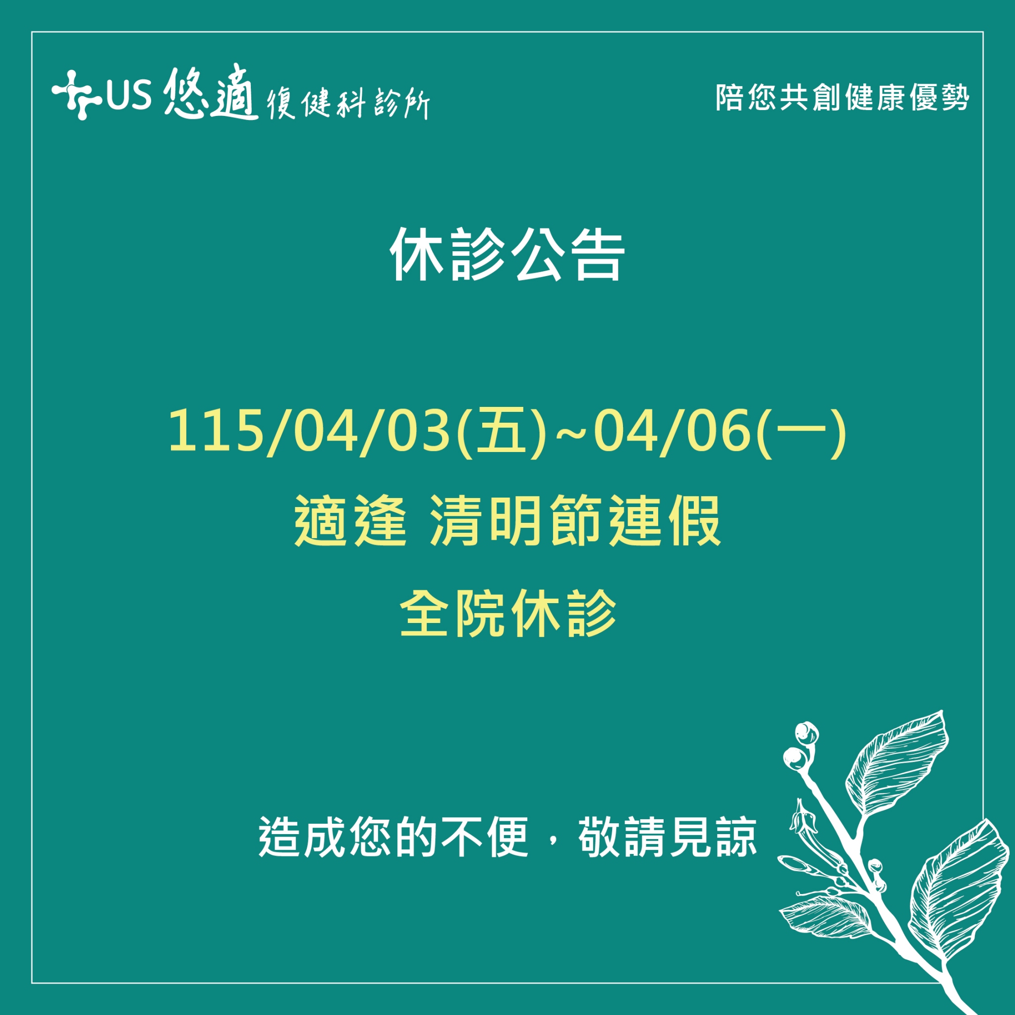 【#悠適復健|清明節連假休診公告】