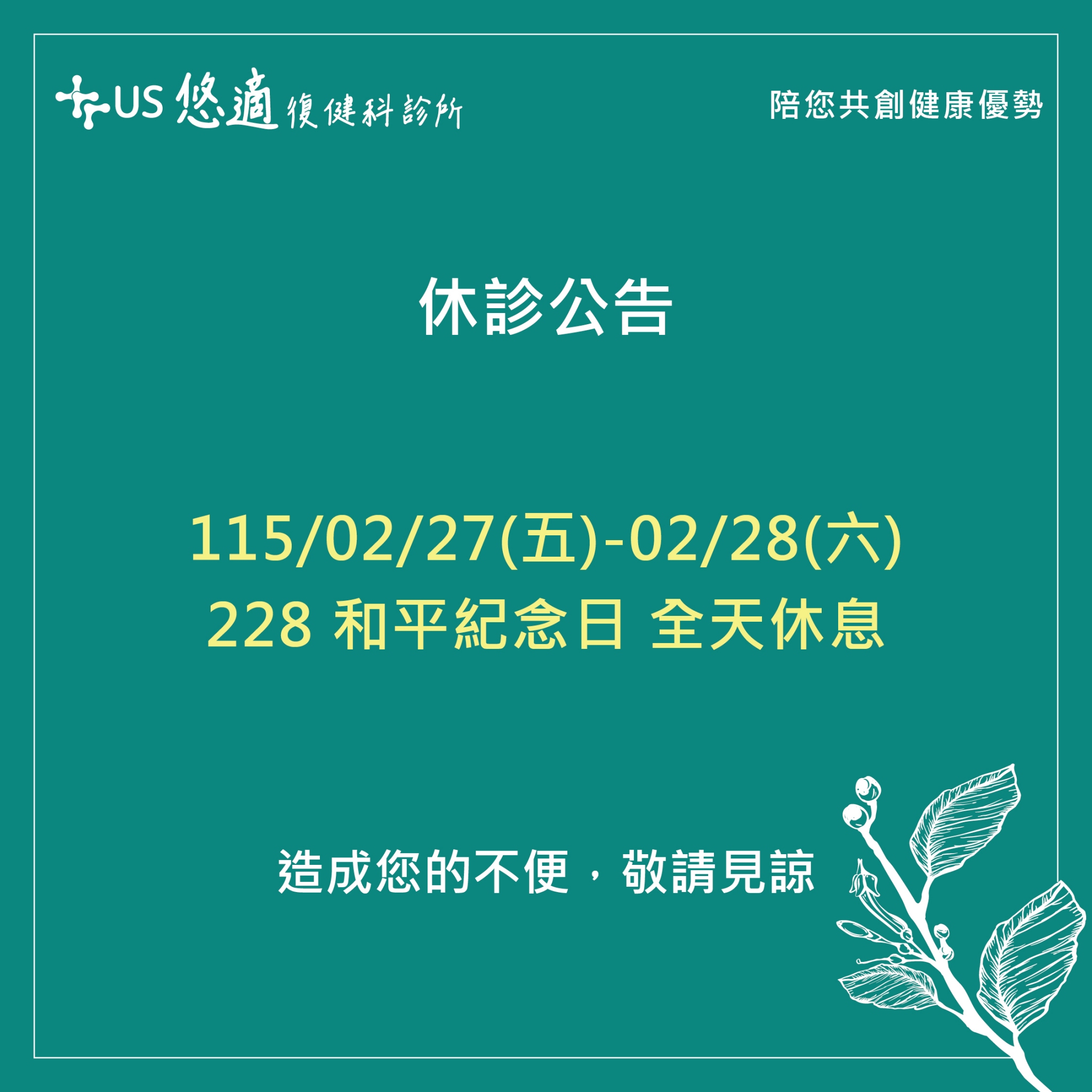 【#悠適復健|228和平紀念日休診公告】