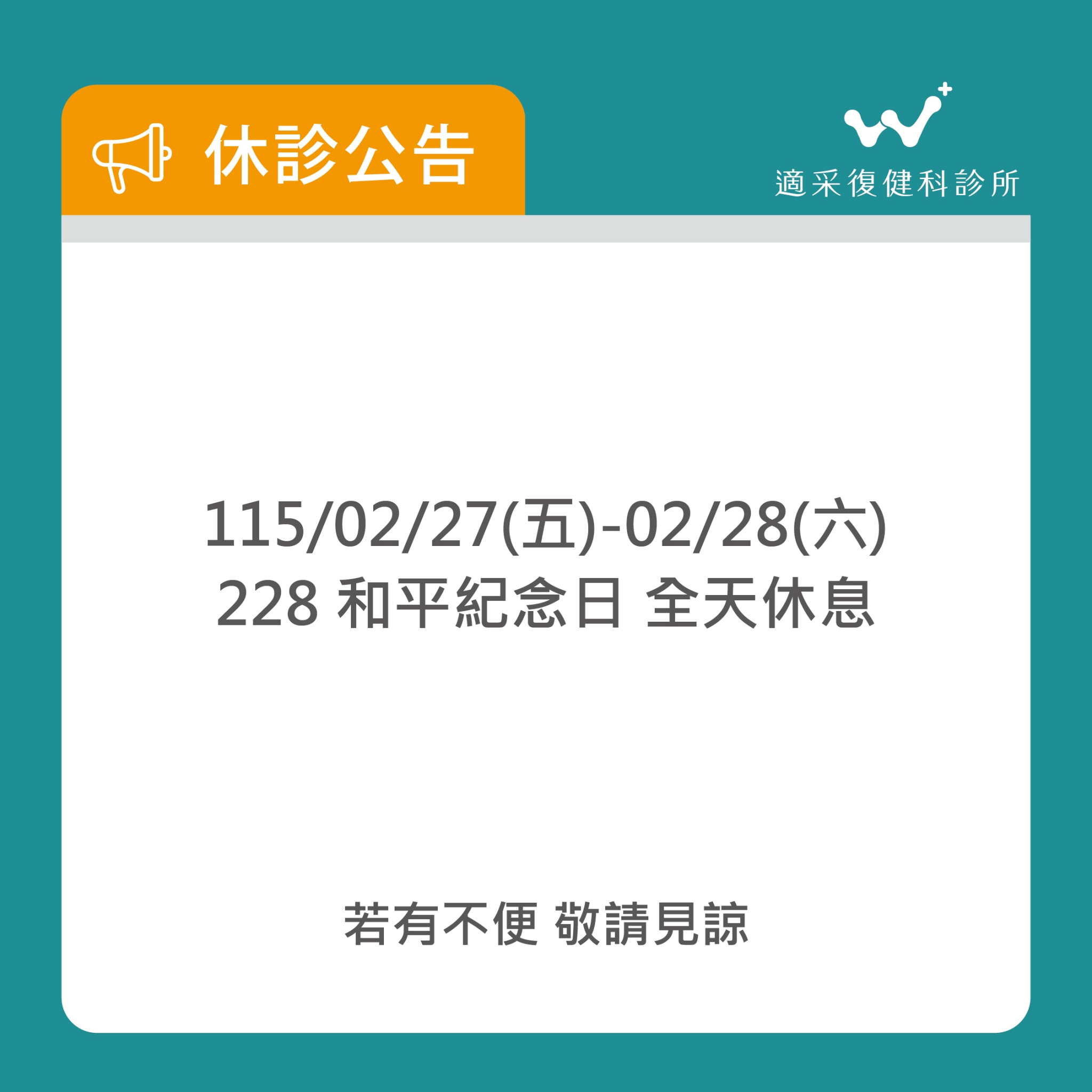 【#適采復健|228和平紀念日休診公告】
