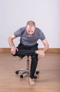 如果已經出現臀部深層的緊繃與痠痛,可以先試著用簡單的方式來舒緩。比如說,找一張穩固的椅子坐好,把要伸展那一側的腳踝放到另一側的大腿上,讓腳呈現像數字「4」的形狀,接著一手輕壓膝蓋,上半身慢慢往前傾,直到感覺臀部微緊、微酸就停住,不需要到痛的程度。每次大約維持三十秒,可以重複三到五次,很多人會覺得緊繃感有明顯緩解。