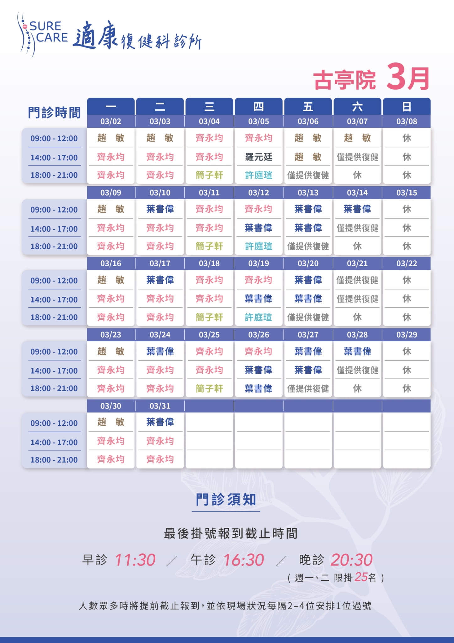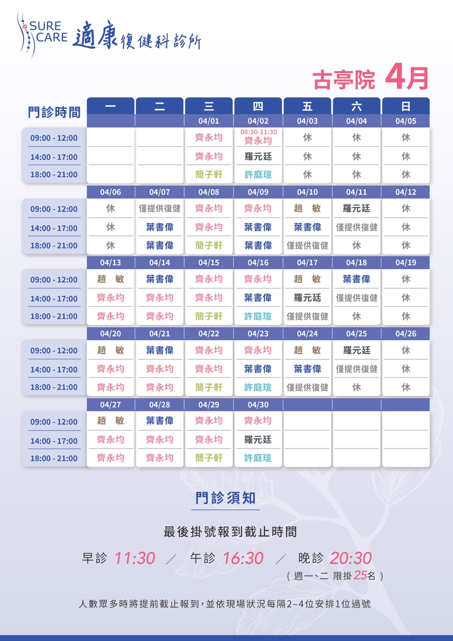 早診 08:30-11:30 (09:00開始看診)