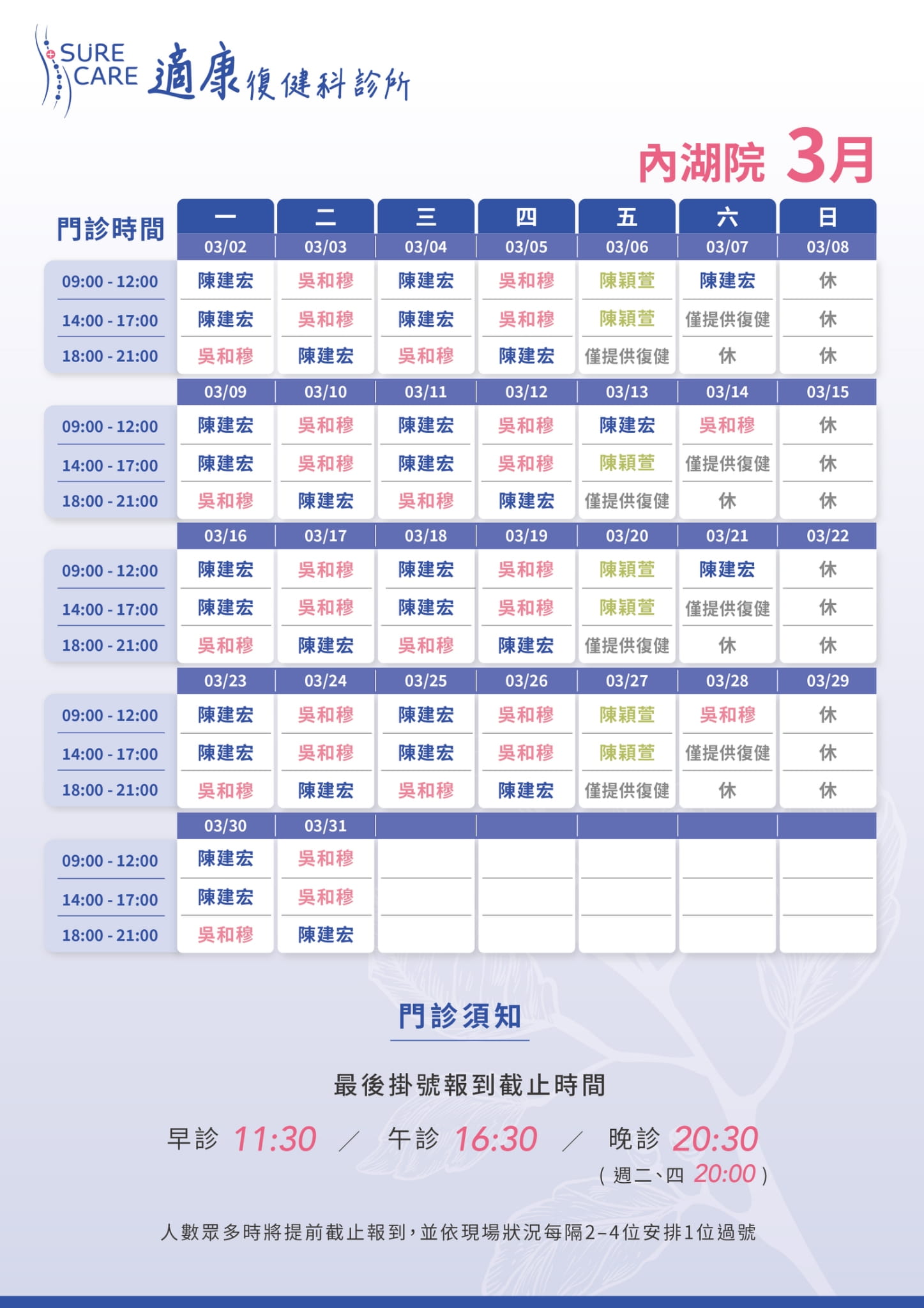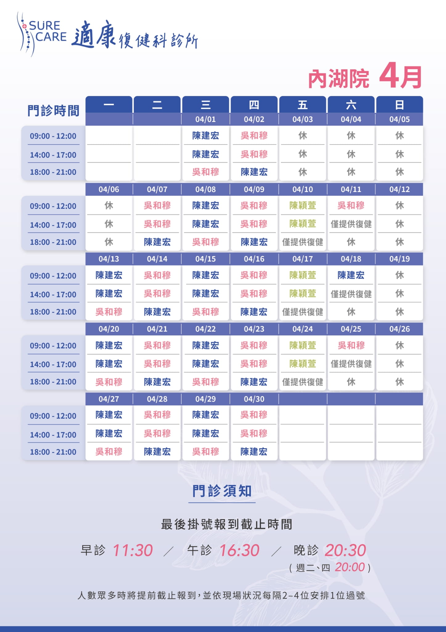 (週二、週四晚診提前至20:00截止)*如遇現場候診病人眾多,將會提前止掛