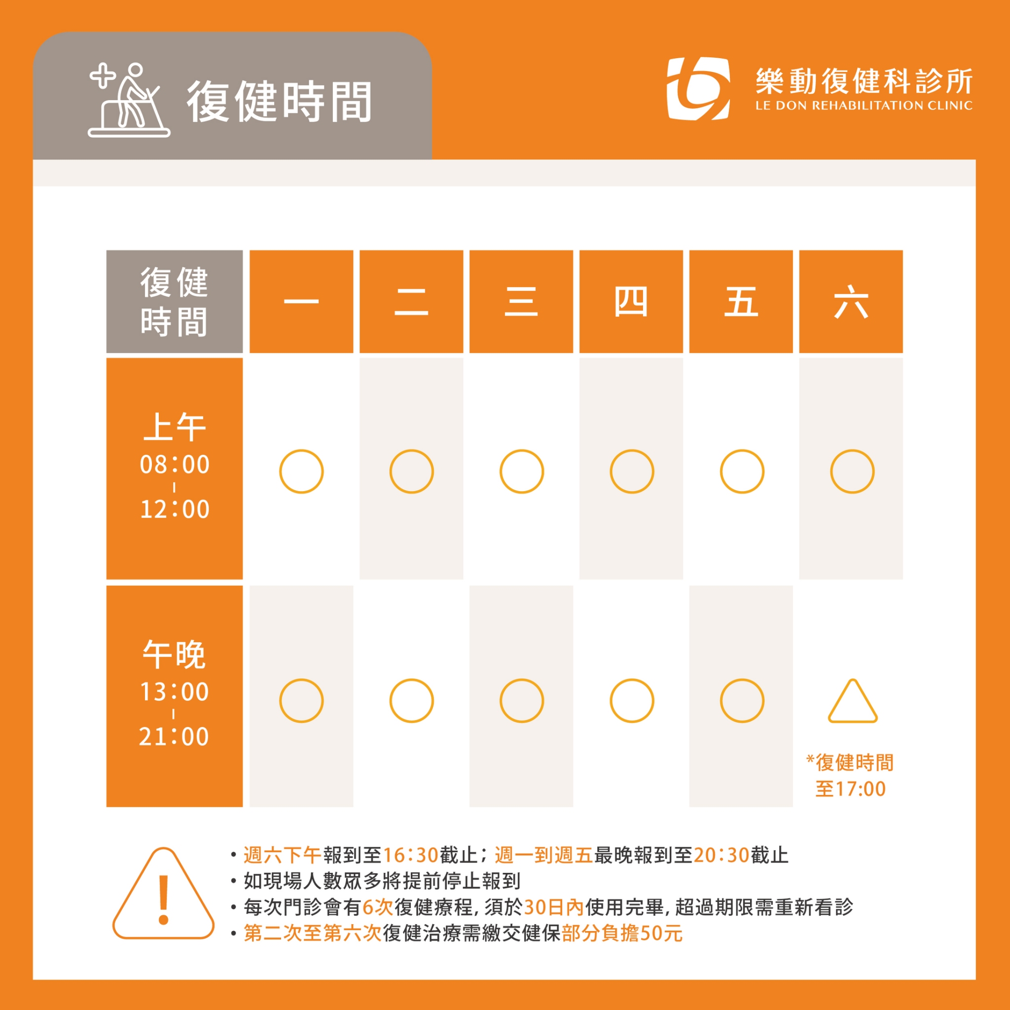 平日 8:00-12:00 13:00-21:00 (前半小時截止報到)