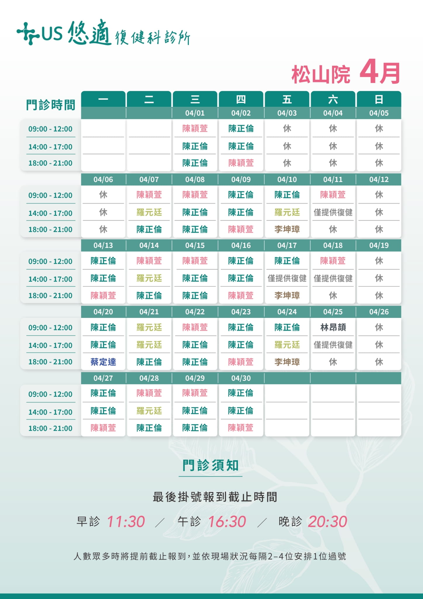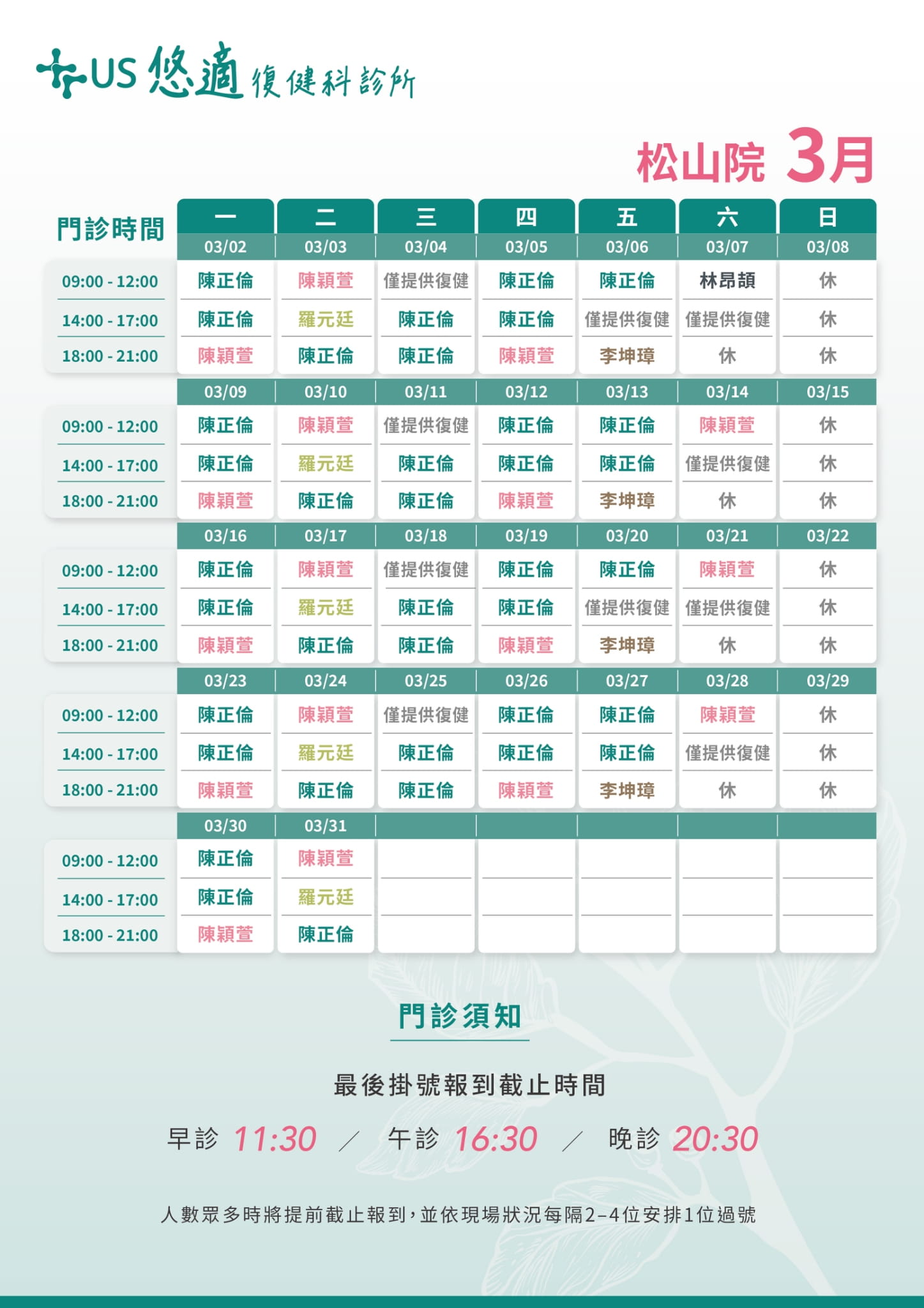 晚診 17:30-20:30 (18:00開始看診)*如遇現場候診病人眾多,將會提前止掛