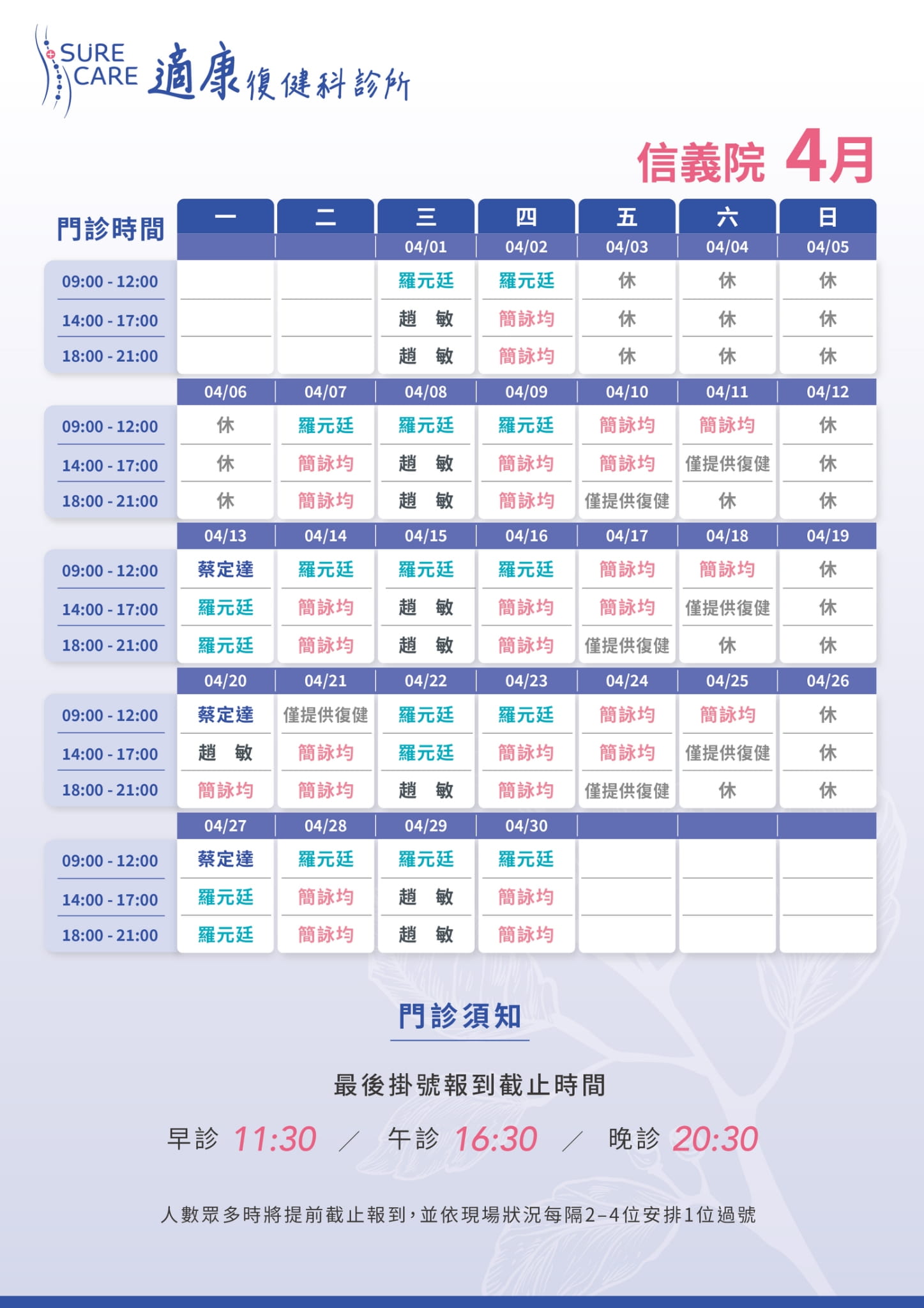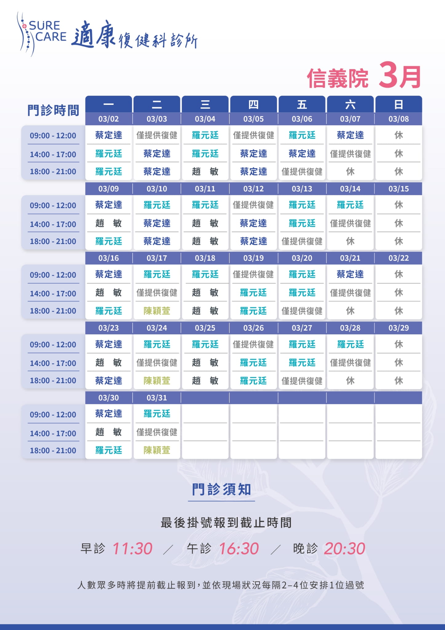 早診 08:30-11:30 (09:00開始看診)