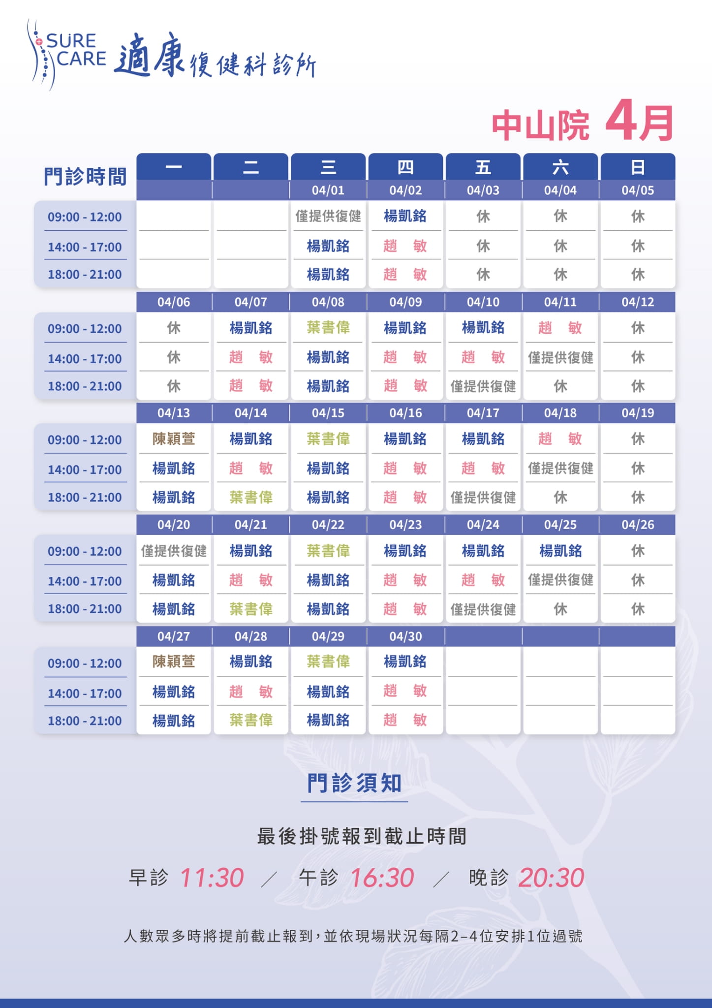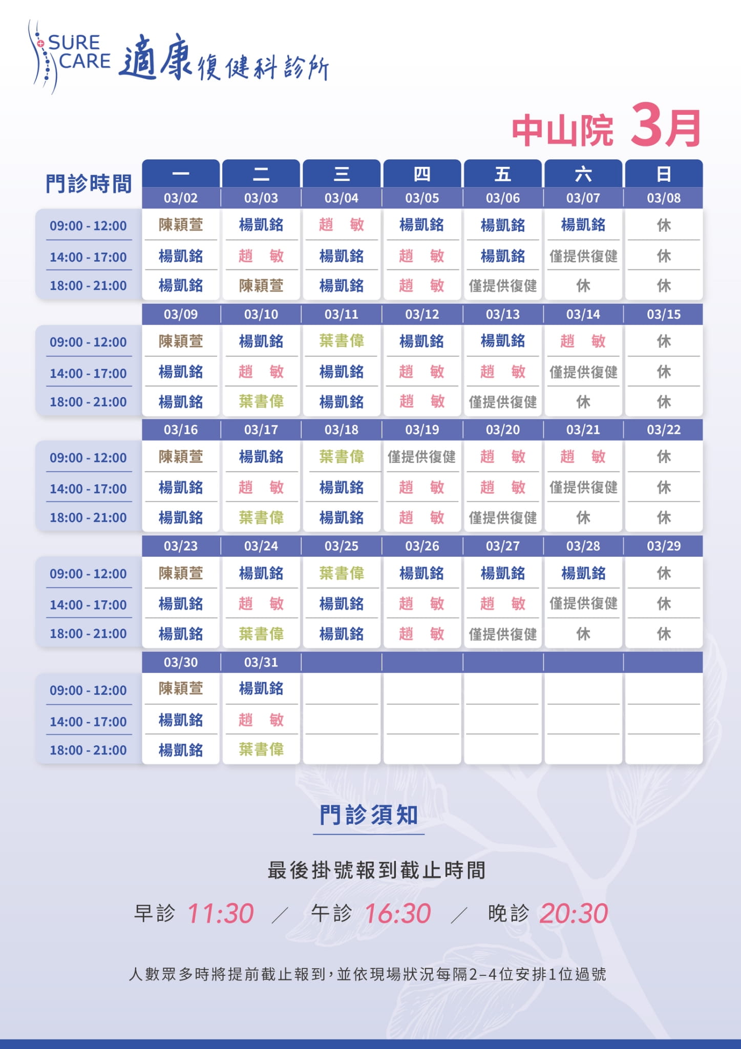 晚診 17:30-20:30 (18:00開始看診)*如遇現場候診病人眾多,將會提前止掛
