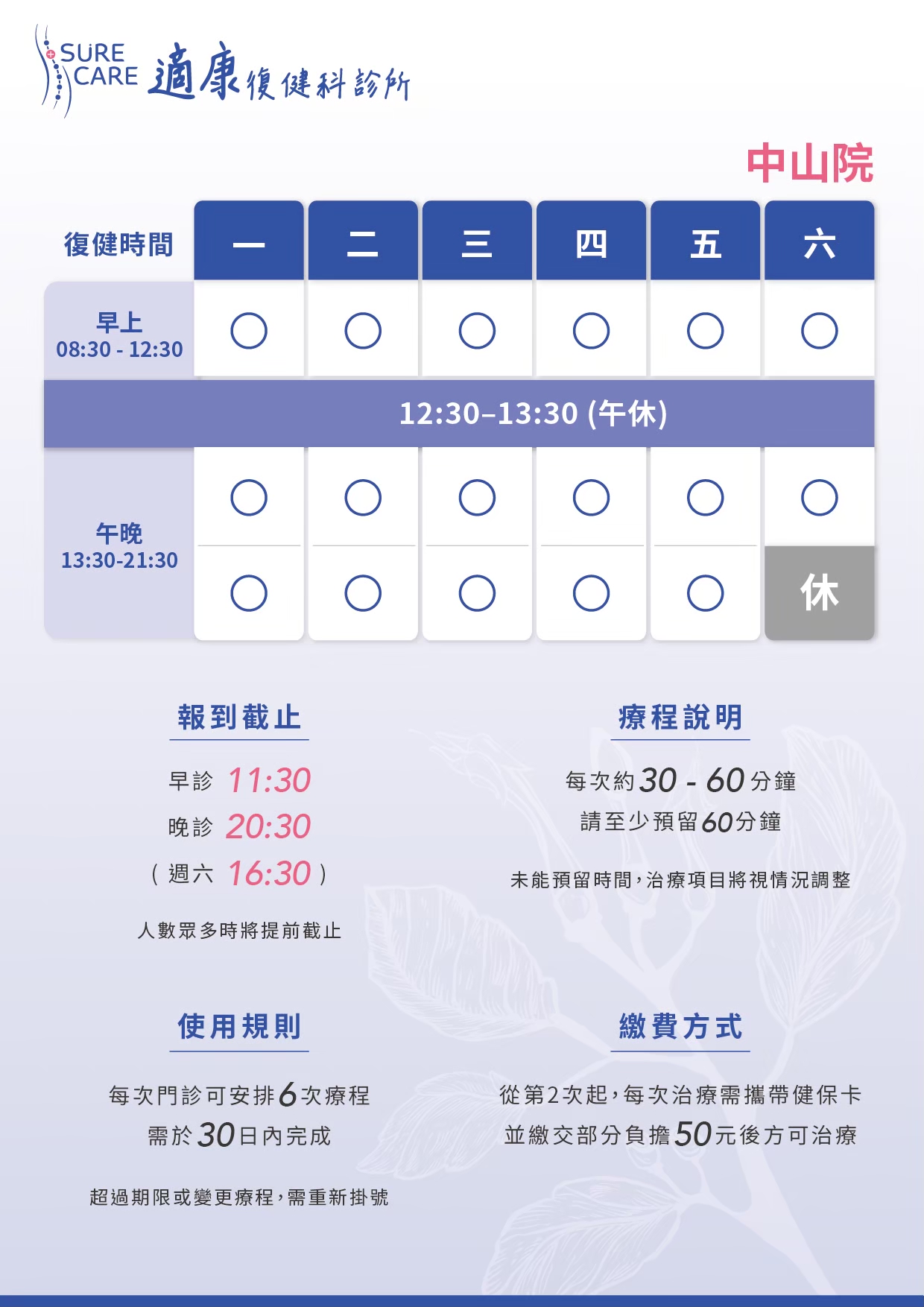 *提醒您請於「該診截止報到」前,攜帶您的健保卡至櫃檯報到 - 復健報到時間 (不需預約)|